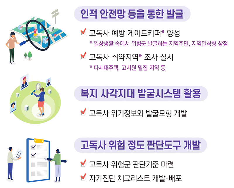 일상생활 속 고독사 위험군 발굴을 위해 지역주민 및 지역밀착형 상점을 고독사 예방 게이트키퍼로 양성하고 고독사 취약 지역·대상 발굴 조사를 강화한다.