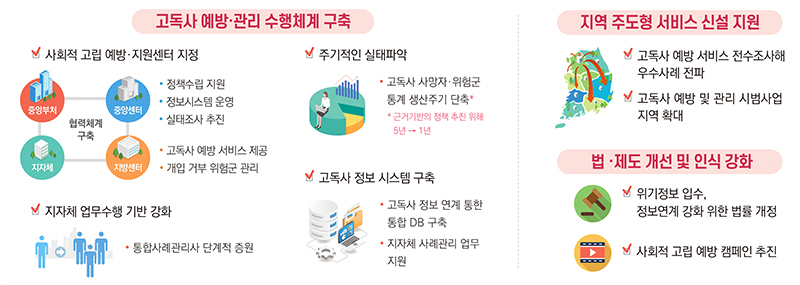 고독사 예방·관리 업무 수행을 위한 중앙·지역별 전문기관 지정, 인력 확충, 정보시스템 구축, 실태파악 강화를 추진한다.