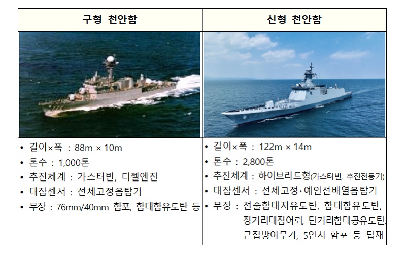 특히, 신형 천안함은 추진체계로 추진전동기와 가스터빈 엔진을 결합한 ‘하이브리드 추진체계’를 탑재해 대잠성능을 크게 향상시켰다.