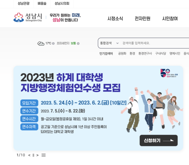 성남시는 오는 5월 24일부터 6월 2일까지 ‘2023년 하계 대학생 지방행정 체험 연수’ 참여 희망자 237명을 모집한다.