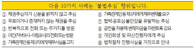 아울러 위반업체나 불법 채권 추심자에 대해서는 수사 의뢰 등 강력한 조치도 내릴 예정이라고 덧붙였다.