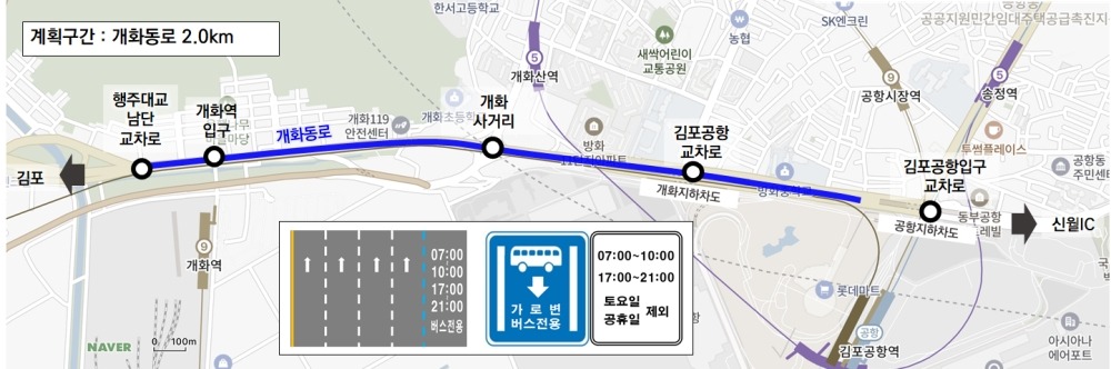 5월 26일 (금) 07시부터 개화동로 행주대교남단 교차로 → 김포공항 입구 교차로까지 가로변 버스전용차로 2.0km 구간이 개통된다. 운영시간은 출퇴근 시간대인 07시~10시, 17시~21시다.