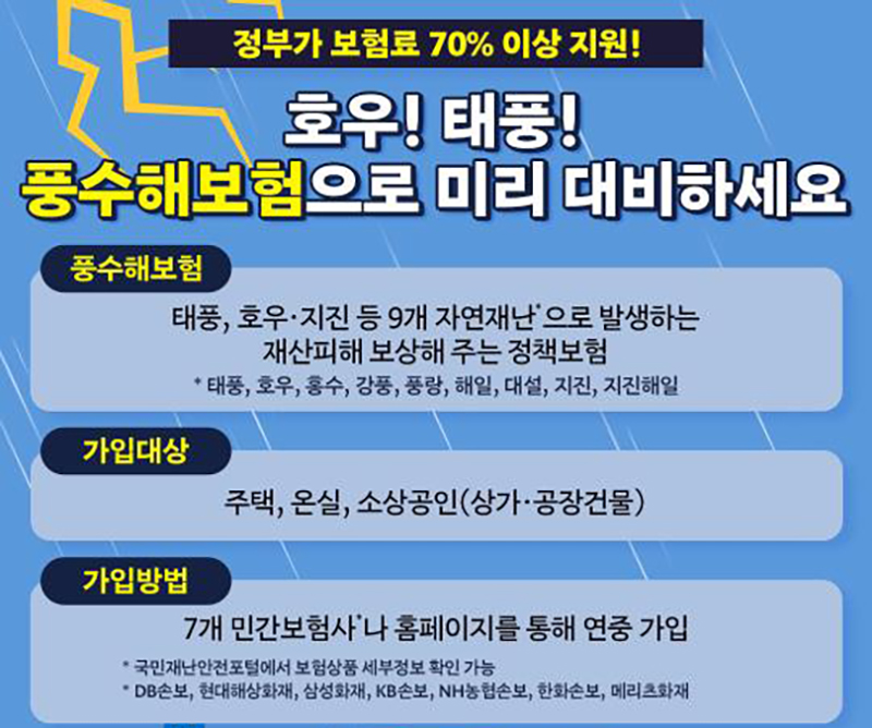 풍수해보험은 태풍, 호우·지진 등 9개 자연재난으로 발생하는 재산피해를 보상해 주는 정책보험으로, 가입 시 총 보험료의 70% 이상을 국가와 지방자치단체에서 지원하고 있다.