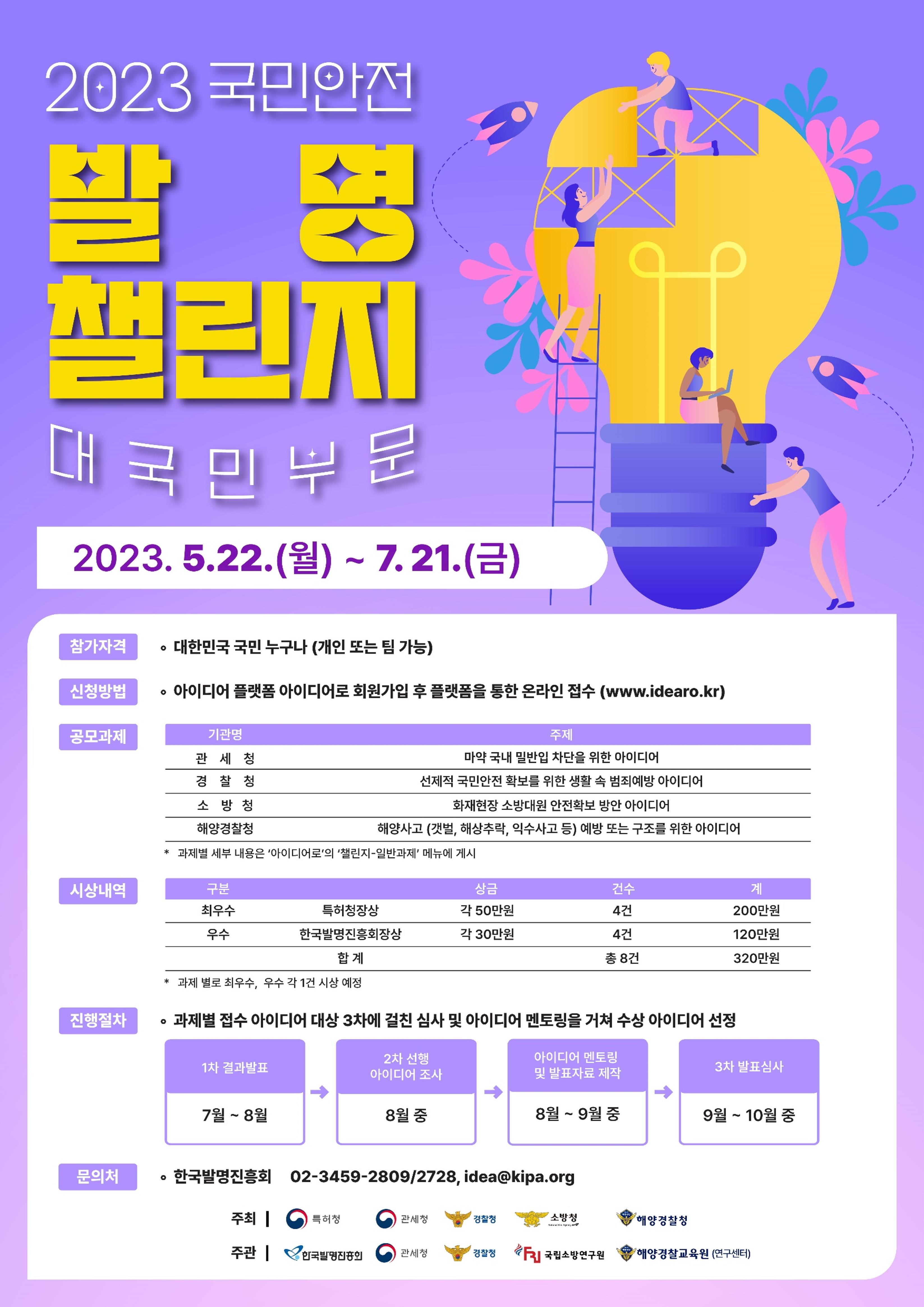 「2023 국민안전 발명챌린지」대국민 아이디어 공모에 보다 자세한 사항은 한국발명진흥회 발명진흥실(☏ 02-3459-2809)로 문의하면 된다. 끝.