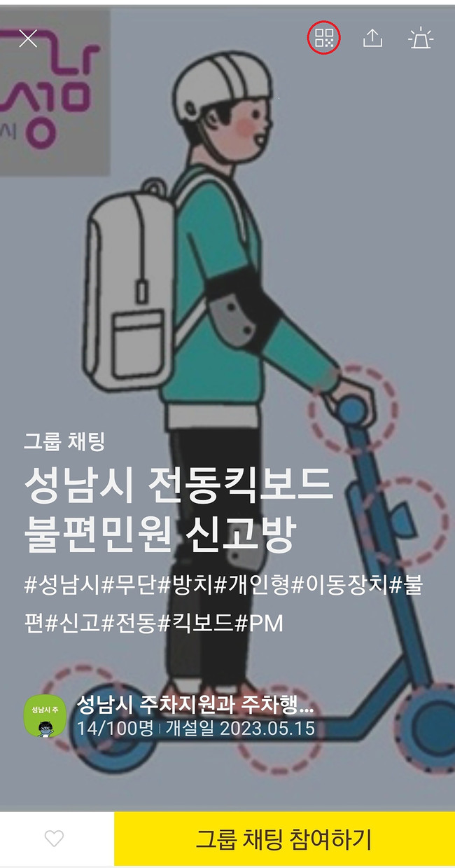신고하려면 카카오톡 오픈채팅방에서 ‘성남시 전동 킥보드’를 검색하거나 QR 코드 스캔으로 입장해 발생일시, 대상 위치, 내용, 현장 사진을 올리면 된다.