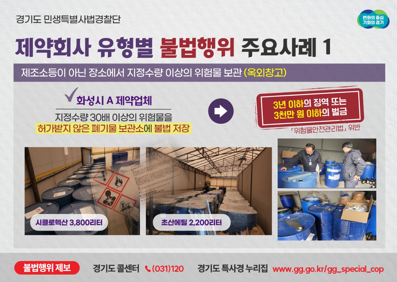 “지정수량 30배 초과 위험물 불법 저장”… 경기도 민생특사경, 무허가 위험물 저장 등 제약회사 불법행위 13건 적발