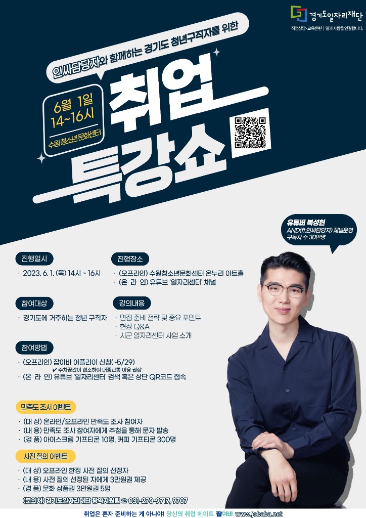 경기도일자리재단은 청년 구직자의 취업 역량 강화를 위한 ‘인싸담당자와 함께하는 취업 특강쇼’를 6월 1일 오후 2시 수원청소년문화센터에서 개최한다.