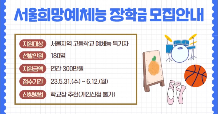 <서울희망예체능 장학금>의 신청자격은 예체능 분야에 재능이 있는 서울소재 고등학교 또는 각종학교 등에 재학 중인 학생으로, 수급자 또는 차상위 계층에 해당하거나 중위소득 90% 이하에 해당해야 한다. 만약 이 기준에 해당하지 않더라도 학교장이 인정한 저소득·위기가구에 해당한다면 학교의 추천을 받아 신청할 수 있다.