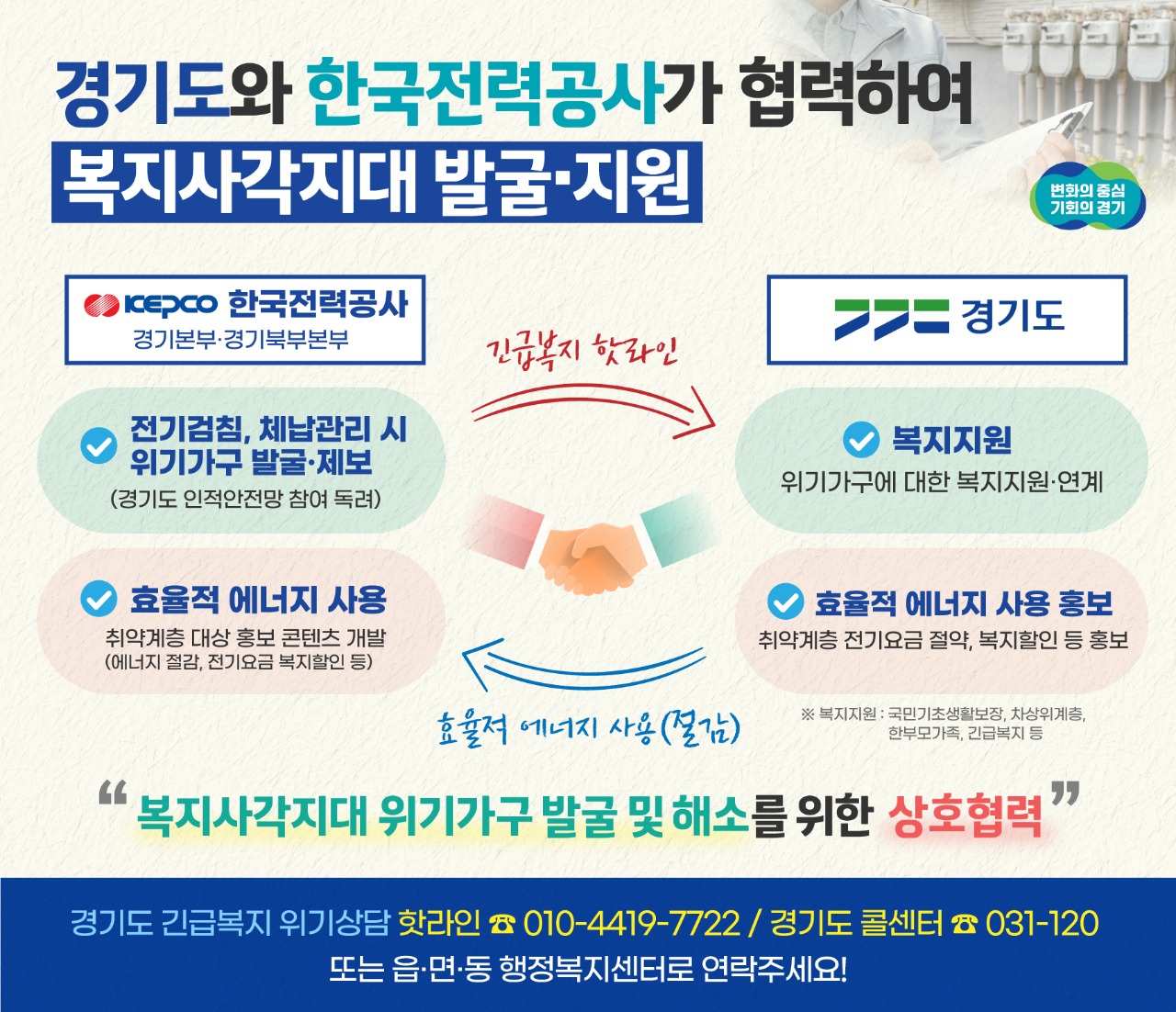 한국전력공사 경기본부와 경기북부본부가 전력량계 검침, 청구서 송달, 전기요금 체납관리 등을 위한 방문 조사 및 전화상담 시 복지 사각지대 위기가구를 확인하면 경기도 긴급복지 위기 상담 핫라인에 전달돼 신속한 복지 지원 절차가 진행된다.