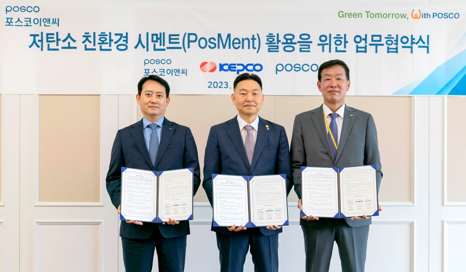 포스코이앤씨(옛 포스코건설), 한국전력공사, 포스코는 24일 포스코이앤씨 송도사옥에서 한국전력공사에서 사용되는 시멘트 제품을 ‘포스멘트’로 활용하기 위한 업무협약식을 가졌다.
