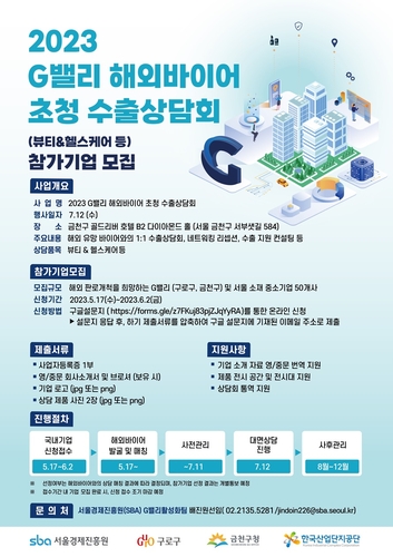 수출상담회 국내기업 모집은 내달 2일까지다. 뷰티, 건강관리(헬스케어) 분야의 G밸리 및 서울시 소재 기업 중 참가하고자 하는 기업은 서울경제진흥원 누리집에 접속 후 '2023 G밸리 해외바이어 초청 수출상담회 참가기업 모집'에서 신청할 수 있다.