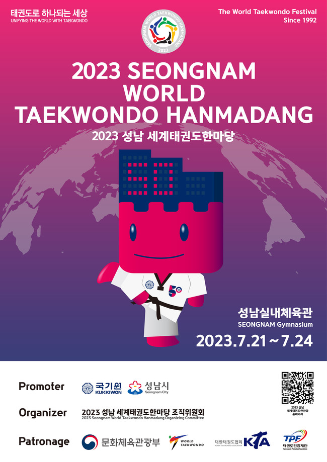대회 포스터는 성남시 승격 50주년 및 세계태권도한마당 개최를 기념하는 캐릭터 ‘탄(TAN: Taekwondo Assembles Nations)’을 메인으로 지구촌 평화, 화합 및 통합을 상징하는 밝고 친근감 있는 이미지를 표현했다.