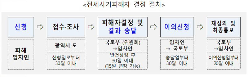 피해자 지원을 신청한 임차인은 관할 지자체의 조사와 전세사기 피해지원 위원회 심의·의결을 거쳐 60일 내에 전세사기 피해자 여부를 결정받는다.