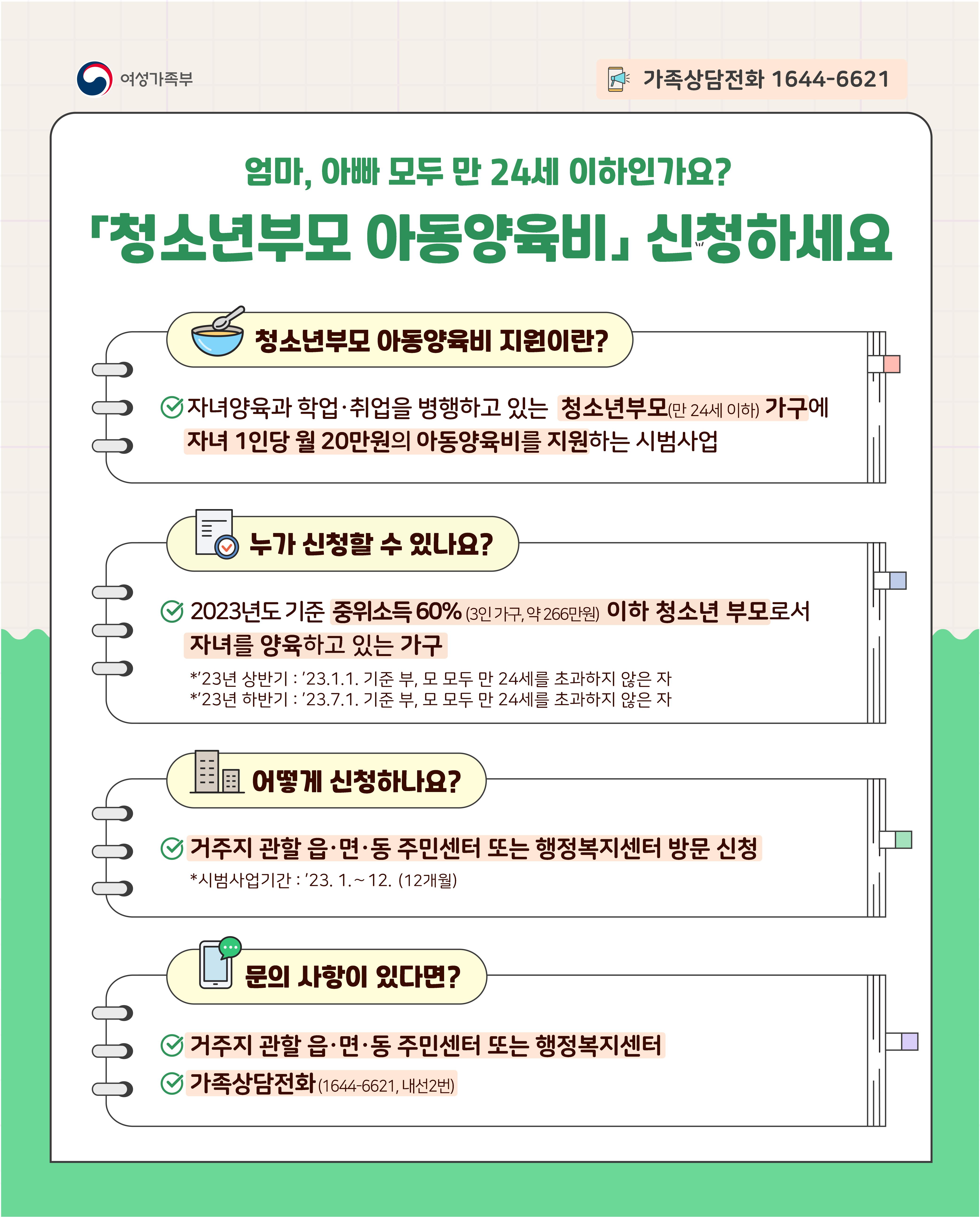 충북도는 지난해에 이어 2023년에도 청소년부모 아동양육비 지원 시범사업을 추진하고 있다.