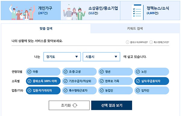 정부24의 맞춤형 서비스는 가구특성, 소득수준, 직종 등 여러 검색조건을 선택하면 현금, 서비스이용권, 요금 감면 및 융자 지원 등 다양한 혜택정보와 혜택을 받기 위한 지원대상, 신청방법 등을 안내받을 수 있다.