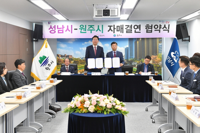 성남시는 30일 시청 상황실에서 강원도 원주시와 상호 교류 및 우호 증진 협력을 위한 자매결연 협약을 체결했다.