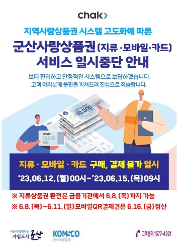전북 군산시는 '지역사랑 상품권 chak' 시스템 개편으로 오는 6월 12일 자정부터 15일 오전 9시까지 군산사랑상품권에 대한 모든 서비스가 일시 중단된다고 밝혔다.