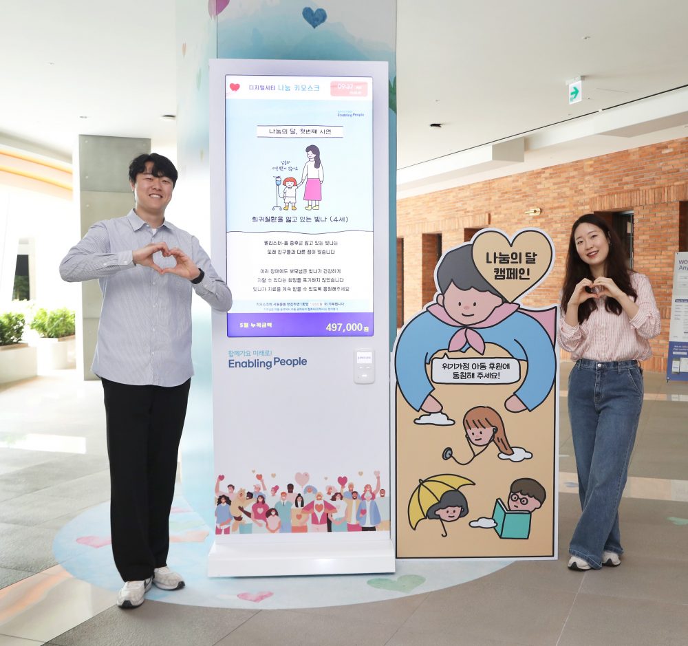 삼성전자 임직원들은 5월 한달 간 사업장에 설치된 총 35대의 나눔키오스크와 캠페인 기간 중 특별 개설되는 ‘온라인 나눔키오스크’를 통해 위기가정 아동 20명을 집중 후원했다.