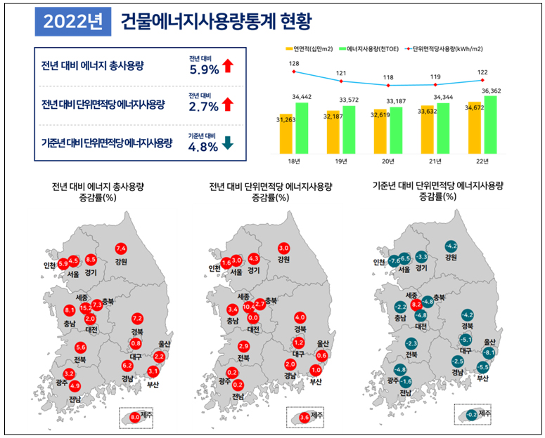 단위 면적당 건물 에너지 총사용량은 전년보다 2.7% 증가한 122kWh/㎡였다. 이는 총사용량 증가율(5.9%)보다는 낮으나 2019년 이후 가장 높은 수치다.