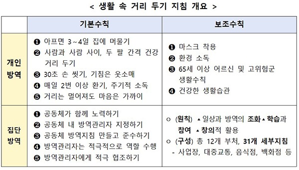 이 지침에 따르면 개인방역 5대 기본수칙은 ▲아프면 3~4일 집에 머물기 ▲두 팔 간격 건강 거리 두기 ▲손 씻기 및 기침은 옷소매 ▲매일 2번 이상 환기와 주기적 소독 ▲거리는 멀어져도 마음은 가까이로 구성되어 있다.
