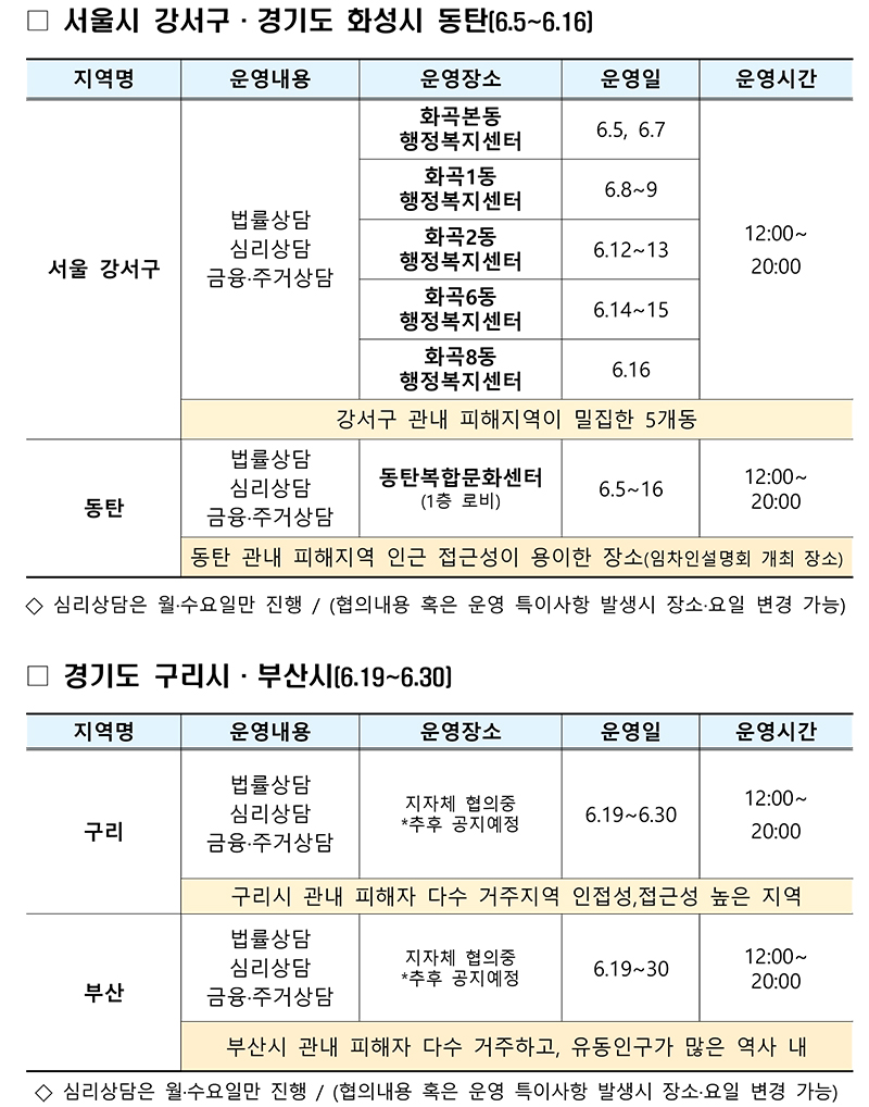 강서에서는 화곡본동·화곡1동·화곡2동·화곡6동·화곡8동 행정복지센터에, 동탄에서는 동탄복합문화센터에 전세피해 상담소를 설치한다.