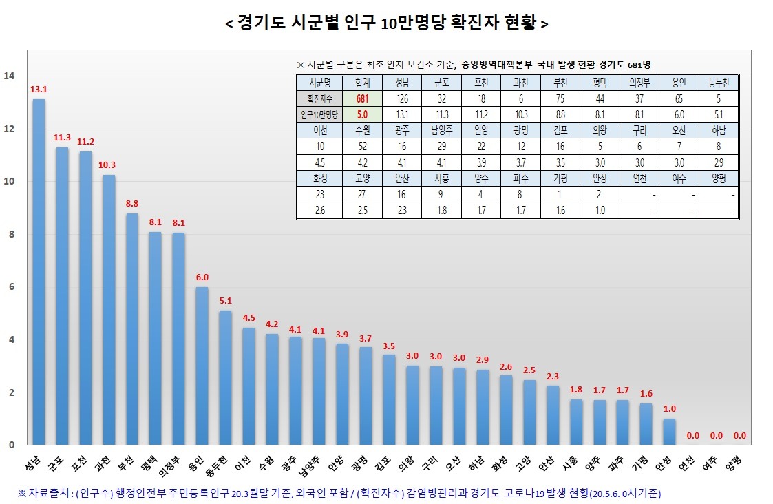 6일 0시 기준 경기도 확진자 수는 681명으로 전일과 동일하다.(전국 1만806명) 인구100만 명 당 확진자 발생 수는 49.7명으로 전국 17개 시도 중 6번째다. 경기도 확진자 중 528명은 퇴원했고, 현재 137명이 병원 및 생활치료센터에서 격리 중이다. 4월 1일 이후 도내 발생한 확진자 180명 중 40%에 해당하는 72명이 해외입국자다.