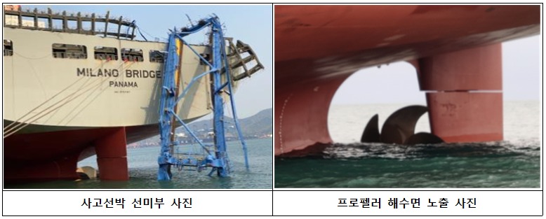 해양수산부는 지난 4월 6일 부산신항에서 발생한 15만톤급 컨테이너운반선(밀라노브릿지, 이하 ‘사고 선박’)과 육상크레인 간 충돌사고가 사고 선박의 프로펠러가 상당부분 수면 위로 노출되어 조종성능이 저하된 상태에서 감속운항 등 특별한 조치 없이 접안을 시도하다 발생한 것으로 드러났다고 밝혔다.