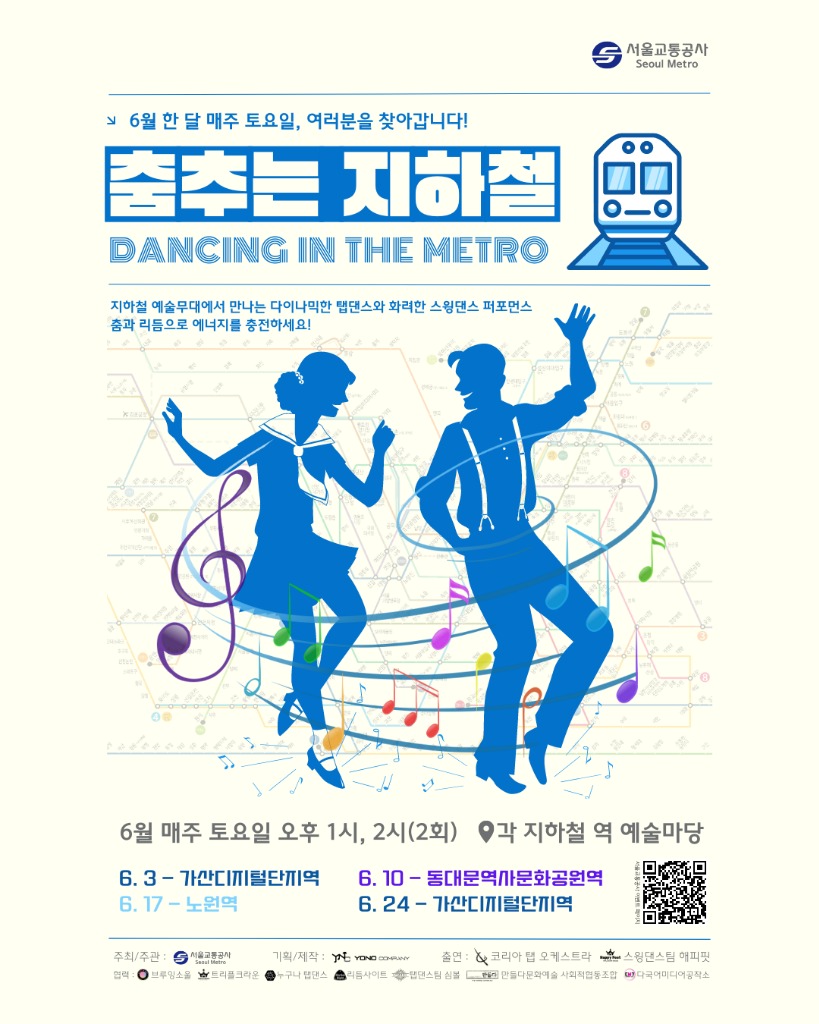 이번 6월, 서울 지하철 곳곳에서 춤꾼들의 댄스축제가 열린다. 서울교통공사(이하, ‘공사’라고 함)는 오는 6월 3일부터 24일까지 매주 토요일마다 지하철 예술마당에서 ‘춤추는 지하철(Dancing in the Metro)’ 를 개최한다고 밝혔다.