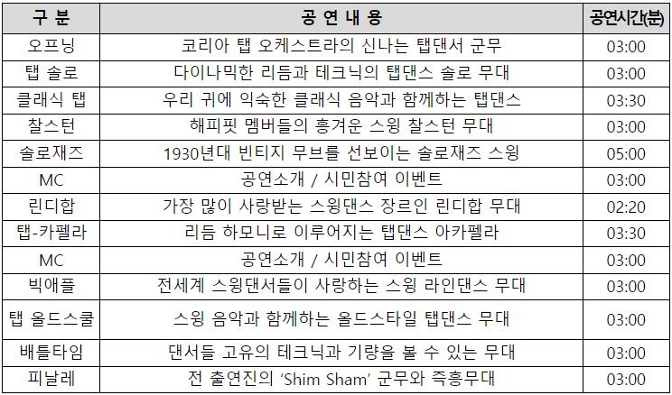 ‘춤추는 지하철’ 공연은 1회당 40분간 다양한 프로그램으로 꾸며진다. <코리아 탭 오케스트라>의 탭 솔로, 클래식 탭 등의 탭댄스 무대와