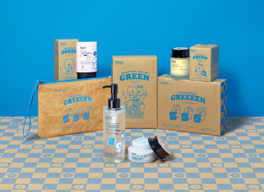 빌리프는 수분 에센스, 수분 크림, 나이트 마스크, 선크림 등 브랜드 베스트셀러 4종의 포장재를 재생 용지 소재의 크라프트팩으로 제작하고 올해 캠페인 아트웍(Artwork)을 패키지 디자인에 적용한 기획 제품을 출시했다. 특히, 제품 용기 부착 등 다용도로 활용이 가능한 라인프렌즈 DIY 스티커를 전 제품에 포함해 소장가치를 높였으며, 프로모션을 통해 종이 섬유 소재인 타이벡(Tyvek)으로 만든 파우치를 증정하는 것이 특징이다.