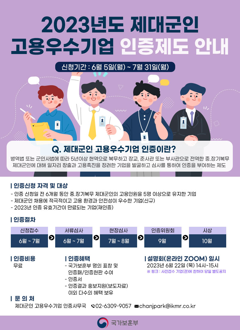 제대군인 고용우수기업 인증제에 대한 자세한 사항은 제대군인일자리과(044-202-5736)로 문의하면 된다.