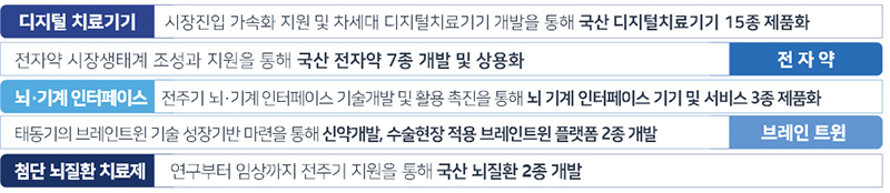 이에 유전자 가위, 오가노이드, 전압 이미징 기술 등 첨단기술을 활용한 혁신적 연구를 지원하고 디지털 치료기기, 전자약, 뇌-기계 인터페이스 등 디지털 기반 뇌융합기술 및 관련 산업을 육성한다.