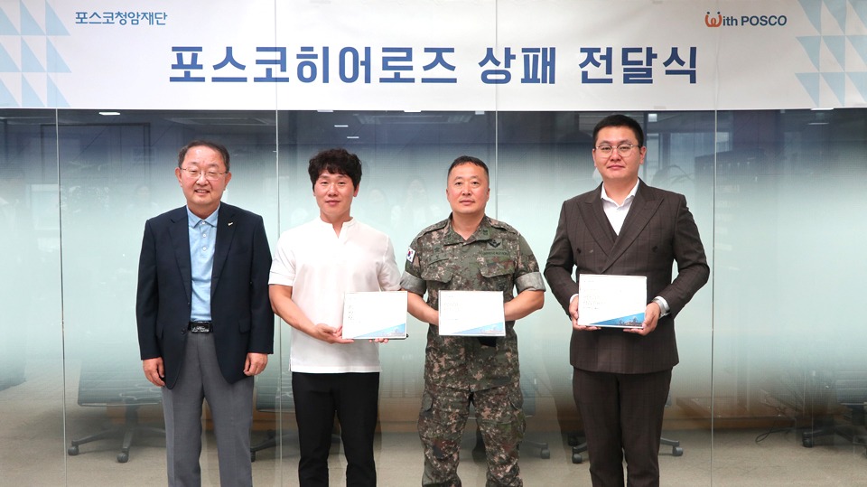 포스코청암재단이 화재 현장에 뛰어들어가 주민을 구하고 초기 진화로 더 큰 화재를 막은 시민 조인수(39)씨, 최형규 상사(45), 이도현(40)씨를 포스코히어로즈로 선정하고 6월 8일 포스코청암재단에서 상패와 자녀 장학금을 전달했다.