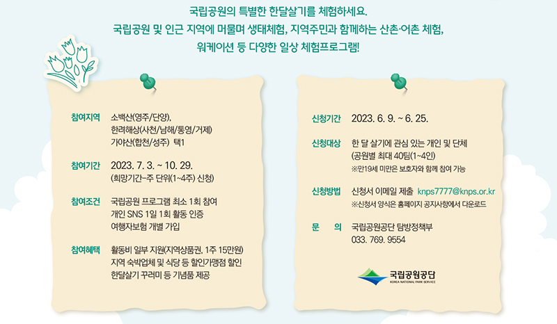 이번 행사 참여자들은 해당 국립공원 지역에서 행사 운영 기간(7월 3일~10월 29일)에 최대 4주간 머물며 SNS에 활동 내용을 올리는 등 ‘국립공원 한 달 살기’ 홍보 활동을 수행한다.