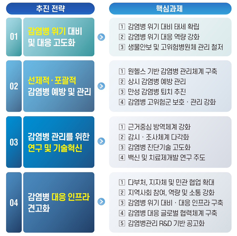 감염병 예방관리 현장의견을 반영해 법·제도를 정비하고 의료시설·방역물자 등 감염병 대응에 필요한 인프라를 견고히 구축하고 글로벌, 다부처·민관 협력체계를 강화하며 연구개발 기반을 다진다.