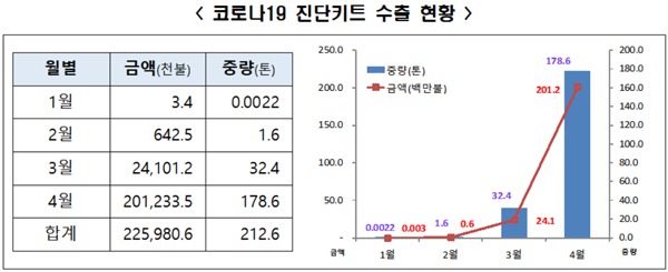 진단키트 수출은 1~2월까지는 미미한 수준이었으나 코로나19 확산추세에 따라 3~4월 들어 급증했다. 특히 4월에는 전월대비 수출금액이 8.35배로 늘어나 2억 123만 달러(약 2466억원)를 기록했다.