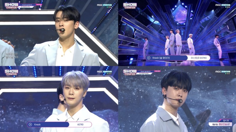 아스트로는 지난 6일 MBC M, MBC every1 ‘쇼! 챔피언’을 통해 신곡 ‘Knock(널 찾아가)’와 수록곡 ‘내 이름을 부를 때’의 음악방송 첫 무대를 선보였다.