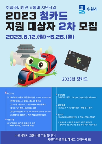 수원시가 '2023년 취업준비청년 교통비 지원사업(청카드 사업)' 지원 대상자 90여 명을 오는 26일까지 모집한다.