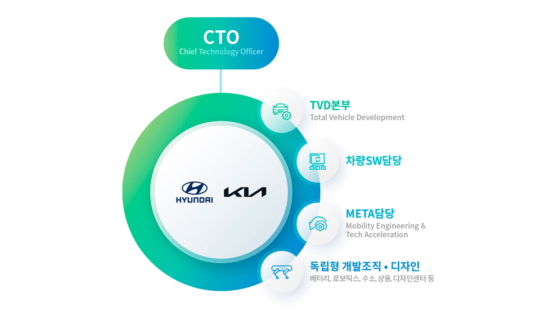 R&D 부문을 총괄하는 CTO(Chief Technology Officer, 최고 기술 경영자) 산하에 ▲TVD(Total Vehicle Development)본부 ▲차량SW담당 ▲META(Mobility Engineering & Tech Acceleration)담당 ▲독립형 개발조직(배터리, 로보틱스, 수소연료전지, 상용)·디자인센터 등 각 부문을 독자적인 개발 체계를 갖춘 조직으로 재편했다.