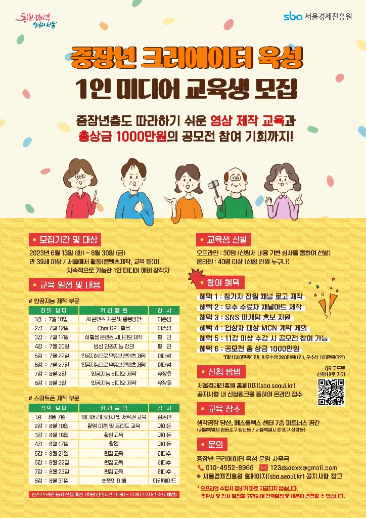 서울시와 서울경제진흥원은 중‧장년층 1인 콘텐츠 창작자 육성을 위해 입문자를 위한 맞춤 교육을 진행한다고 밝혔다. 총 70명을 선발해 교육하며, 교육 수료자에 한해서 총 상금 1천만원의 영상 공모전 참가 자격도 제공한다.