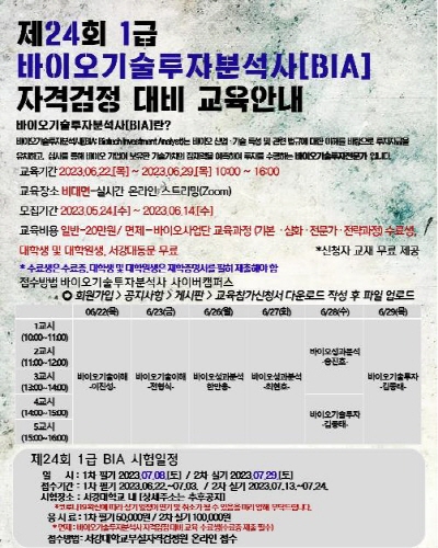 제24회 1급은 1차 필기 과목으로 바이오기술이해, 바이오성과분석, 바이오기술투자 3과목으로 구성돼 있으며, 2차 실기시험을 포함한다.