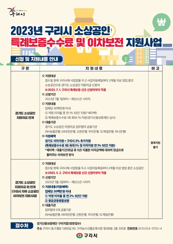 이에 따라 구리시는 내달 1일부터 '소상공인 특례보증수수료 지원사업'을 본격 시행한다. 이번 사업은 경기도 소상공인 지원자금 신규 대출을 받은 소상공인을 대상으로 최대 3천만 원의 대출 및 그 융자금의 최대 1퍼센트의 보증수수료를 지원하는 사업이며 신규 1회에 한한다.