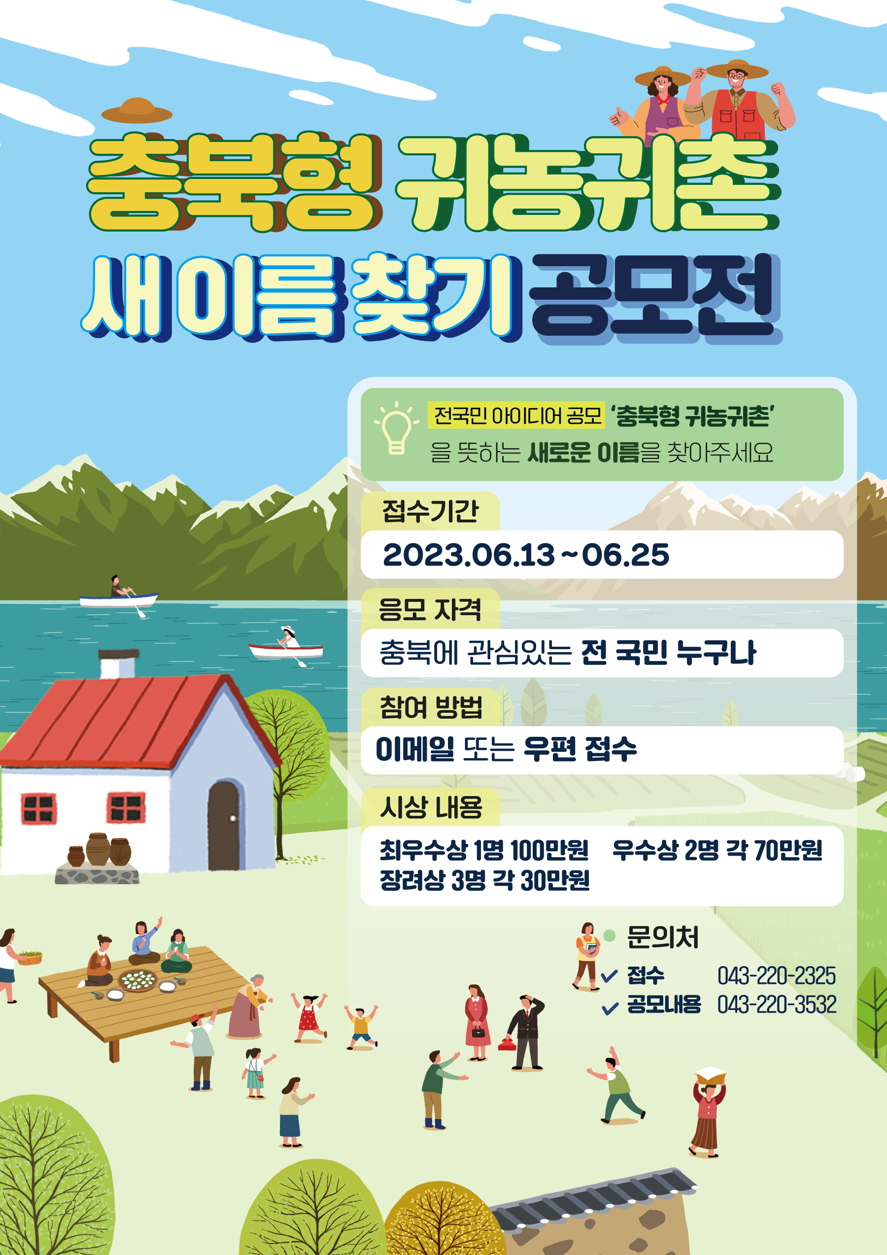 접수된 내용에 대해 선호도 조사와 전문가 심사 등을 거쳐 ‘충북형 귀농귀촌 새이름’을 확정할 계획이다.