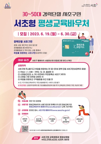 서울 서초구가 배움과 취업을 원하는 3050세대의 경력단절 구민 600명에게 월 20만 원 상당의 평생 교육바우처를 지원한다.