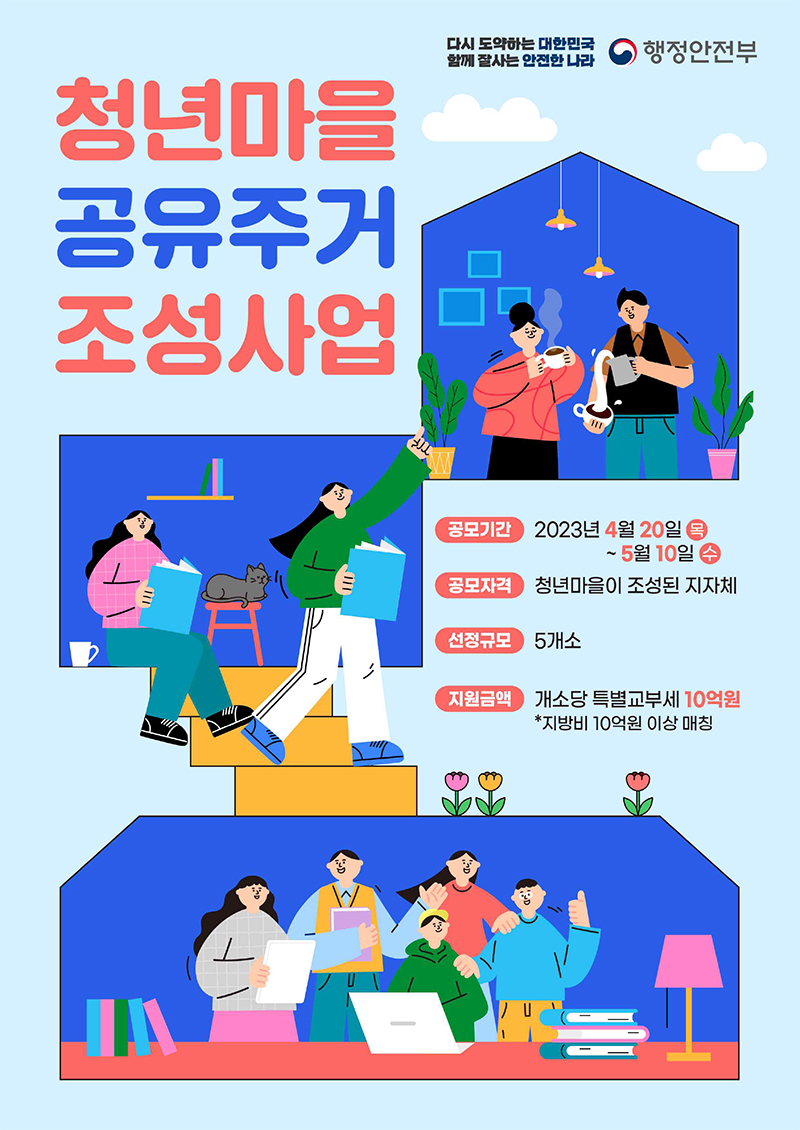 행정안전부는 청년마을이 조성된 지자체를 대상으로 올해 청년마을 공유주거 조성사업을 공모해 이들 5개 지자체를 최종 선정했다고 14일 밝혔다.