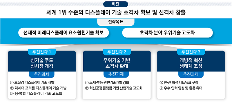 한편 미래 디스플레이 R&D 추진전략은 향후 디스플레이 분야 세계 1위 수준의 초격차 기술 확보를 목표로 한다.