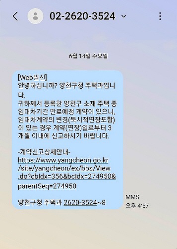 서울 양천구는 관내 11,235호 등록민간임대주택사업자를 대상으로 임대차계약 만기 3개월 전 신고 의무를 문자로 사전 안내하는 '미리알림서비스'를 시행한다고 밝혔다.