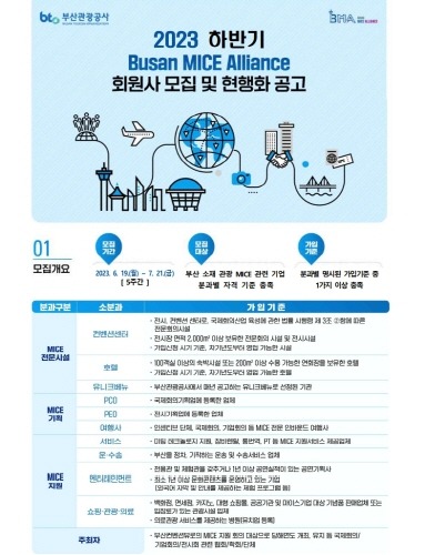 부산관광공사(이하 공사)는 2023년 하반기 부산 마이스(MICE) 얼라이언스 신규회원사를 6월 19일부터 7월 21일까지 모집한다고 15일 밝혔다.