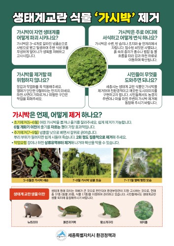 또한 강, 하천 등 수변을 따라 확산하는 가시박 특성을 고려해 세종시로 유입되는 강·하천의 상류지역인 인근 지자체에 가시박 제거 협조를 요청하고, 유관단체 등 대시민 홍보도 추진 중이다.