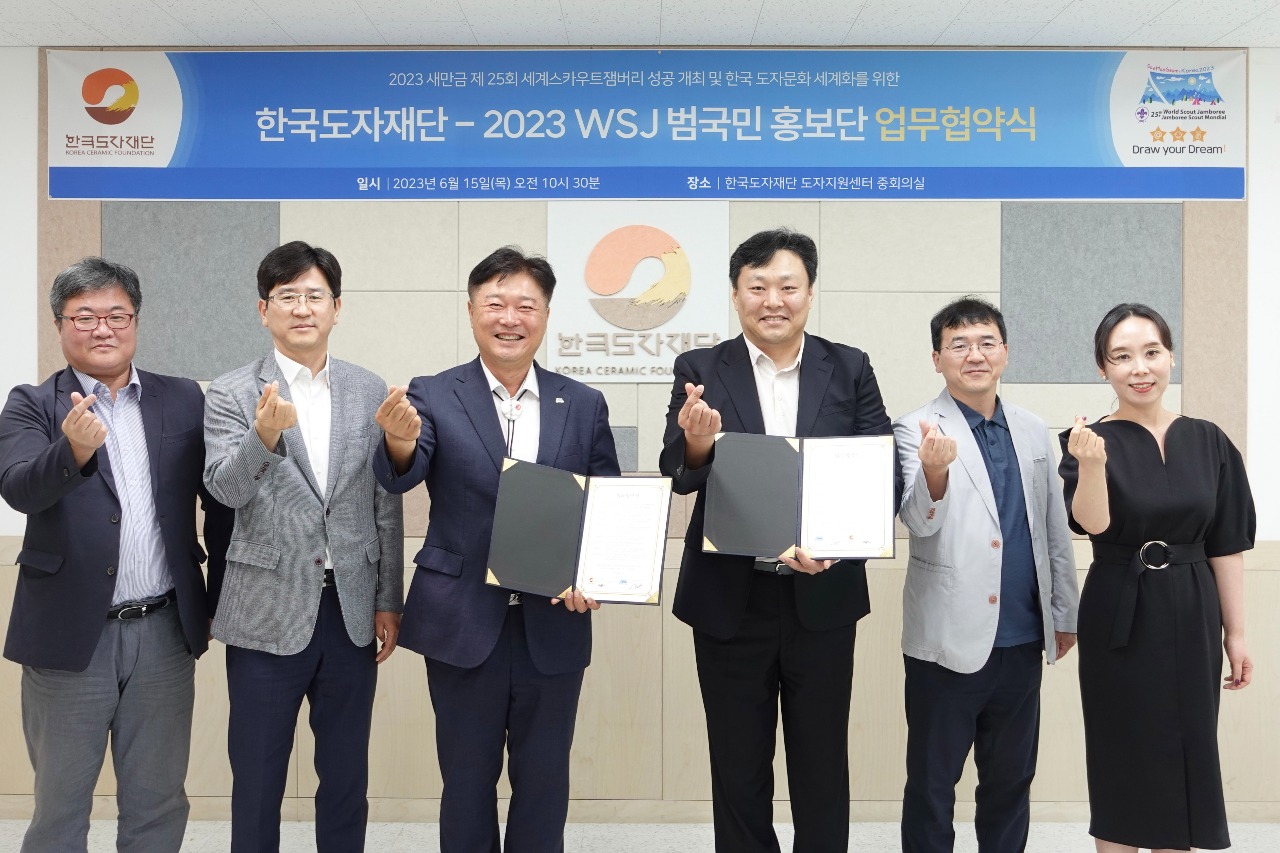 한국도자재단과 2023 WSJ(World Scout Jamboree) 범국민 홍보단이 15일 한국도자재단 이천 도자지원센터에서 ‘2023 새만금 제25회 세계스카우트잼버리 성공 개최 및 한국 도자문화 세계화’를 위한 업무협약을 체결했다.
